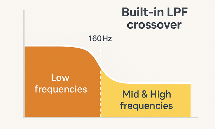 Vďaka vstavanému LPF crossoveru sa zvukový signál automaticky oddelí, takže subwoofer reprodukuje iba nízke frekvencie. To vám umožní vyťažiť maximum z každého nastavenia bez dodatočných filtrov alebo nastavení.